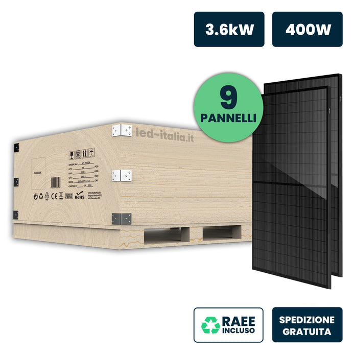 Set 3.6kW con 9 Pannelli Solari Fotovoltaici Moduli 400W TIER-1, Monocristallini PERC, Full Black IP67/IP68 1722x1134x30mm