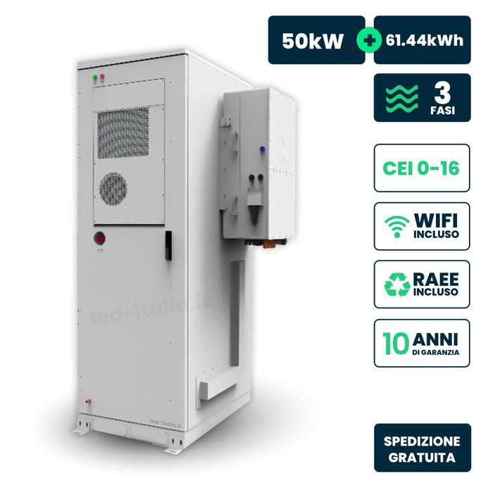 Kit Fotovoltaico Alta Tensione Deye con Inverter Ibrido Trifase 50kW e Accumulo LiFePO4 61.44kWh CEI 0-21 CEI 0-16, WiFi e TA Inclusi, Garanzia 10 Anni IP55
