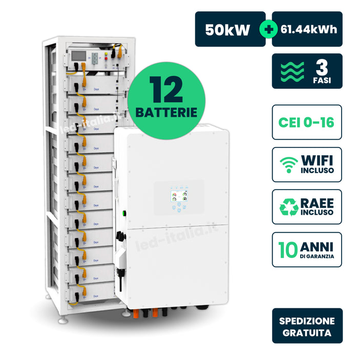 KIT Fotovoltaico con Inverter Trifase Ibrido Deye 50kW WiFi TA + Sistema di Accumulo LiFePO4 61.44 kWh con HV Box BMS e Armadio Rack CEI 0-21 CEI 0-16 Garanzia 10 Anni