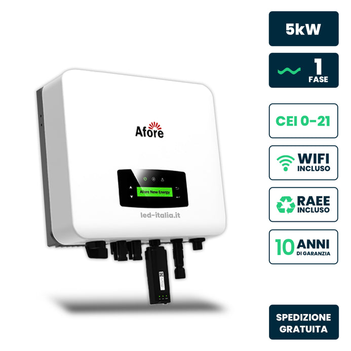 Inverter Fotovoltaico di Rete On-Grid Afore Monofase 5kW, Doppio MPPT, CEI 0-21, WiFi Incluso, Garanzia 10 Anni IP65