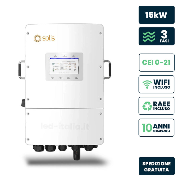 Inverter Fotovoltaico Solis Trifase Ibrido On-Grid/Off-Grid 15kW, Doppio MPPT, CEI 0-21, Schermo LCD, WiFi Meter e TA Inclusi, Garanzia 10 Anni IP66