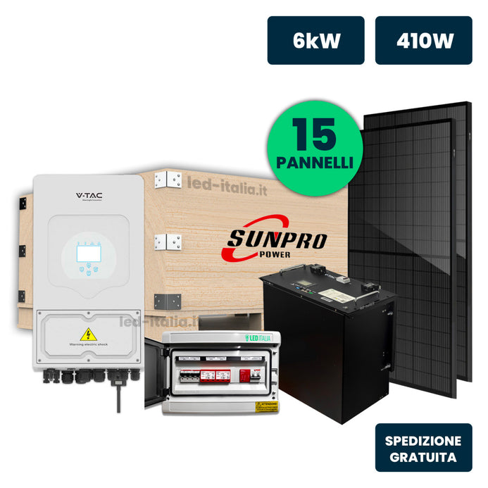 KIT Fotovoltaico Monofase 6kW con Inverter Ibrido, 15 Moduli TIER-1 410W (6.15kW) Full Black con Accumulo LFP 10kWh e Quadro Combinato 2-2 AC-DC 6kW