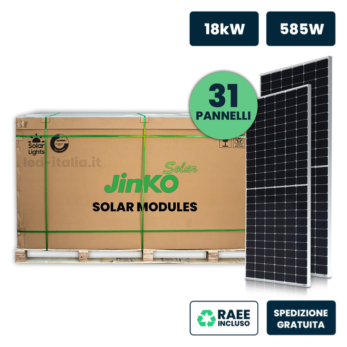 Bancale 18kW con 31 Moduli Fotovoltaici JINKO Solar TIER-1 da 585W Tiger Neo, Monocristallini N-Type TOPCon, Silver Frame 2278x1134x30mm IP67/IP68 (SKU 12286)