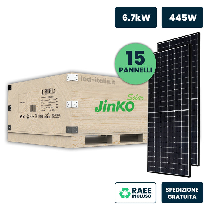 Set 6.7kW con 15 Pannelli Solari Fotovoltaici Moduli 445W JINKO Solar TIER-1 Tiger Neo, Monocristallini N-Type TOPCon, Black Frame IP67/IP68 1762x1134x30mm